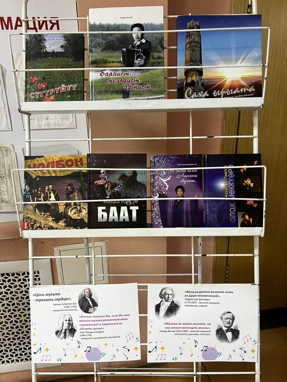 В материалы выставки вошли книги посвященные известным якутским исполнителям и группам, сборники песен, биографии композиторов и мелодистов.