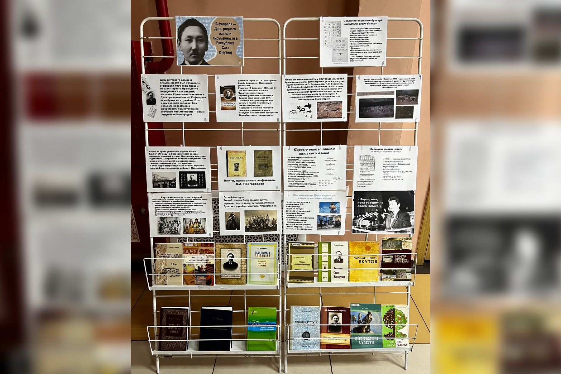 На выставке представлены материалы по истории якутской письменности, биография автора якутского алфавита, первого якутского лингвиста С.А. Новгородова и его избранные труды.