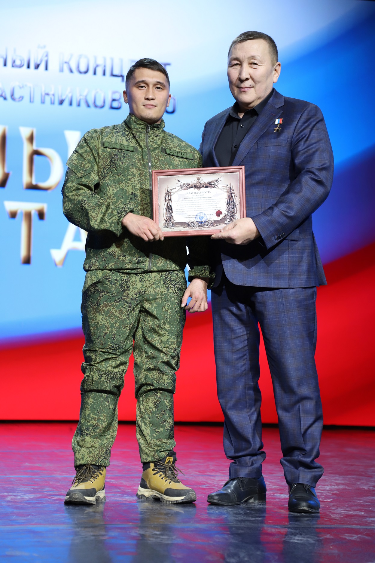 Во время концерта была проведена церемония вручения медалей общественного признания «Отец солдата». Эта награда – символ народной признательности родителям, воспитавшим защитников России, медалью награждаются мужчины-отцы, чьи сыновья проявили мужество, отвагу, самоотверженность или героизм при выполнении боевого задания в ходе специальной военной операции.