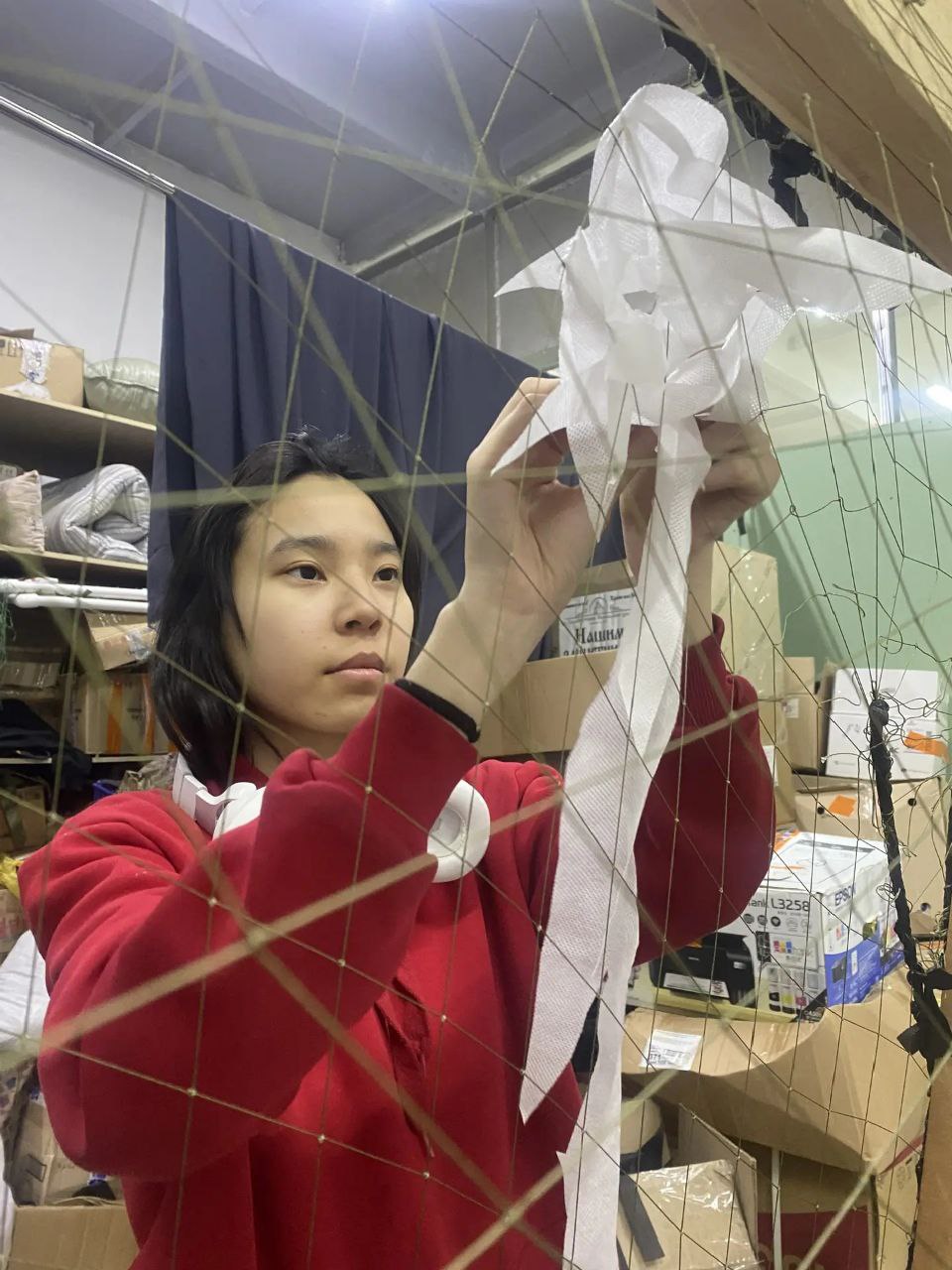 В штабе студенты трудились на ставших уже традиционными работах – плетении маскировочных сетей в зимней расцветке и заготовке материалов и элементов для камуфляжа.