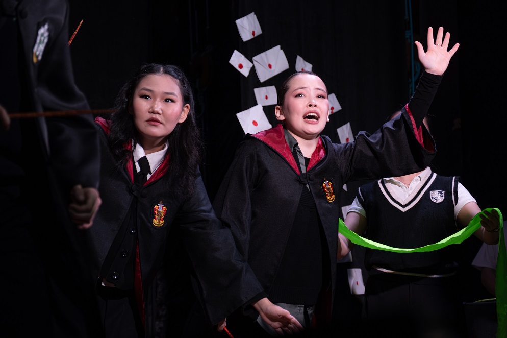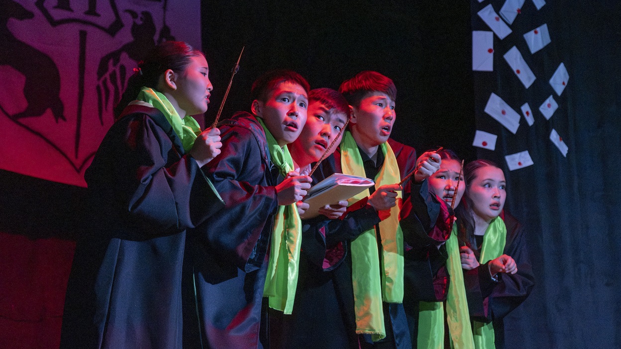 Зритель с самого входа был погружен в волшебную атмосферу – зрительский зал был украшен флагами в заданном стиле, везде светили яркие гирлянды, погружая в атмосферу волшебства, а входная дверь была загадочной платформой 9 и 3/4!